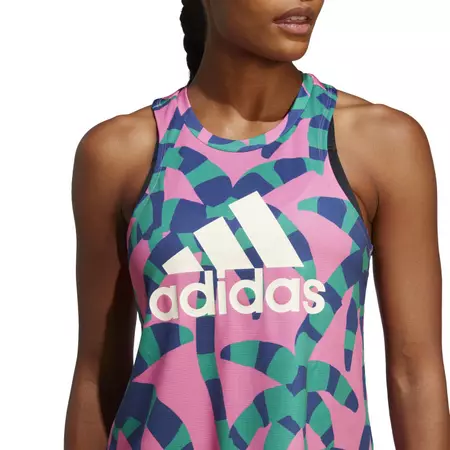 Remplissez-vous d'énergie. Ce débardeur Adidas présente un imprimé saisissant créé en collaboration avec la firme brésilienne FARM Rio.La combinaison de couleurs avec des éléments tropicaux et des corps en mouvement élève votre humeur et vous motive à tout donner. Bougez librement avec elle en cours de danse ou à la salle de sport.