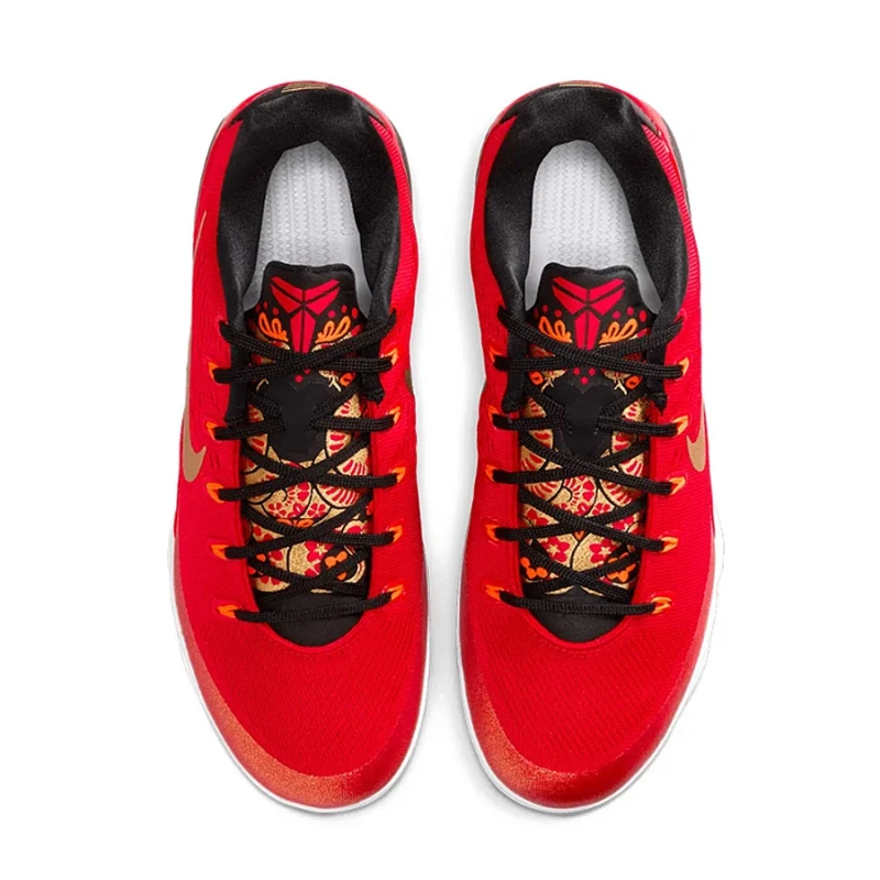 - Empeigne en mesh technique rouge universitaire avec détails or métallisé et noir. Deux serpents entrelacés ornent la languette, symbolisant l'équilibre et la dualité, en référence à son surnom « Black Mamba ».
