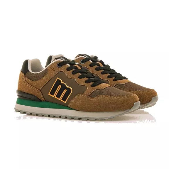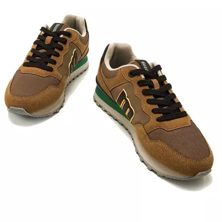 Baskets Porland Classic Mustang pour hommes. Conçu en marron, il comprend des panneaux de différentes textures en cuir marron, noir et vert. Logo de la marque brodé sur le côté. Semelle dentée pour une marche plus stabilisée. Ils vous emmèneront aussi loin que nécessaire.