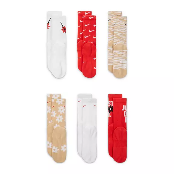 Les chaussettes Nike Everyday Plus apportent style, plaisir et positivité. Cet ensemble de six paires est conçu pour jouer toute la journée grâce à la technologie Dri-FIT. De son style coloré aux imprimés fleurs et zèbres, c'est une valeur sûre.