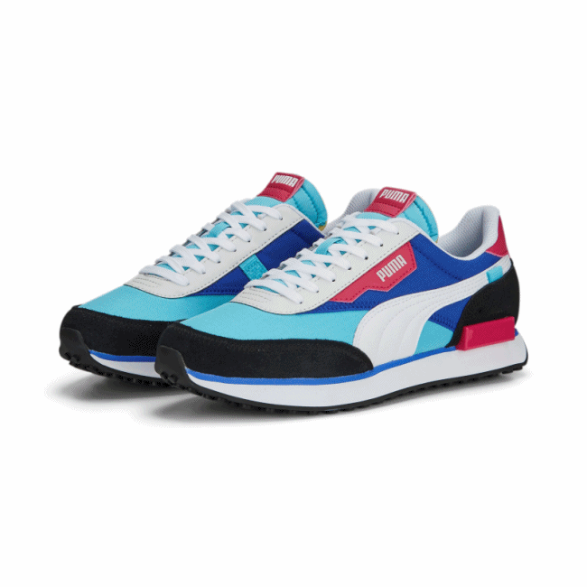 L'audacieuse Future Ride Play On est basée sur un modèle sorti dans les années 1980, lorsque les chaussures de ville commençaient tout juste à occuper le devant de la scène. Ce modèle intègre toutes sortes d'éléments de design modernes, y compris des détails en nylon rembourré léger, des renforts en daim et en cuir, une semelle PUMA Federbein absorbant les chocs et la technologie Rider Foam qui augmente la stabilité et le confort.